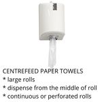 Centrefeed paper towels are good when you want a continuous paper towel. They are harder to control the amount the users take. Some dispensers offer restrictions to ensure only one paper towel is dispensed at a time. Centrefeed paper towels are ideal for use in cleaning down benches in kitchens and workshops.
