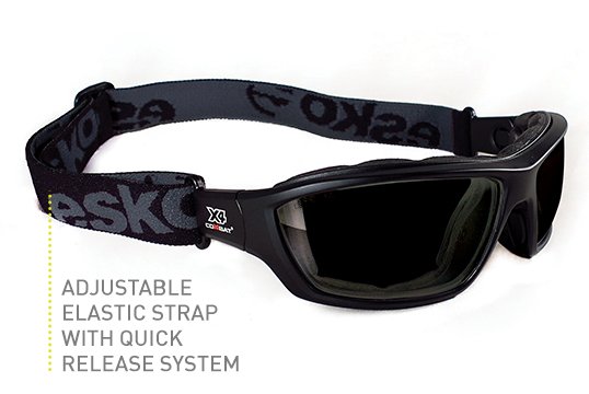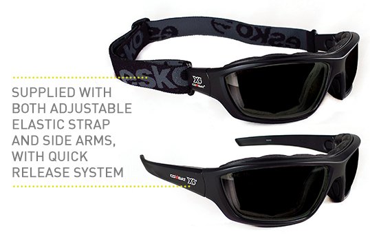 - Supplied with both adjustable elastic strap or side arms - quick release system