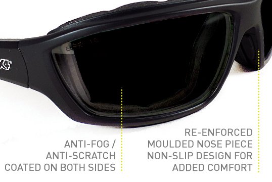 - Anti-fog / Anti-scratch coated on both sides