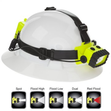 This Dual-Light' Multi-function Headlamp is cETLus, ATEX, IECEx and MSHA listed Intrinsically Safe Permissible for use in hazardous situations. The headlamp features a multi-position tilt head design, a rear-mounted battery compartment and includes both an elastic head strap with a non-slip lining and a heavy-duty rubber strap for use with hard hats. The top mounted dual switches provide spotlight, full-power white floodlight, half-power white floodlight and red low beam night vision operation.