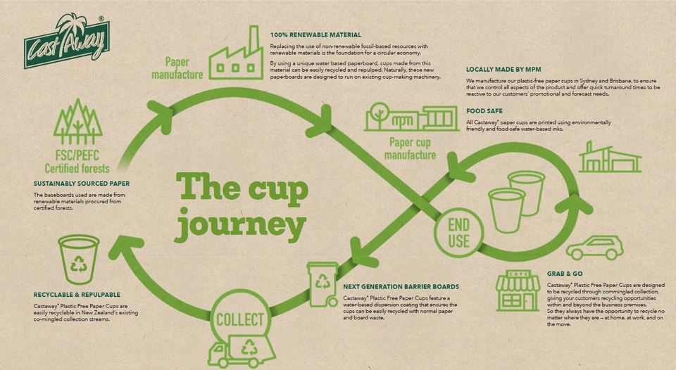 The existing recycling processes used to recycle paper in New Zealand’s infrastructure can be reused to recycle Castaway® plastic free coffee cups — no matter where they