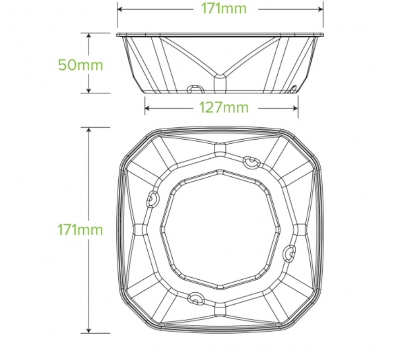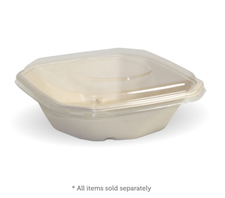Our 750ml natural Octa takeaways are made from reclaimed and rapidly renewable sugarcane pulp, a by-product made of the sugar refining industry. They have an unique octagonal shape for a premium look and feel. Certified carbon neutral and home compostable.