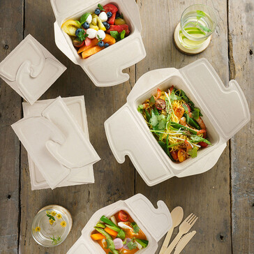 Convenient, easy to use and certified home and commercially compostable.. Made from renewable plant materials - sugar cane and bamboo, these new food boxes have clever folding lids that securely lock into place and are perfect for take-out and delivery meals. Once opened, the folding lid can be easily removed to reveal table-ready dishes for enhanced presentation. Oven, microwave safe and freezer safe with secure double locking lids to prevent gaps from forming to help food retain its temperature.