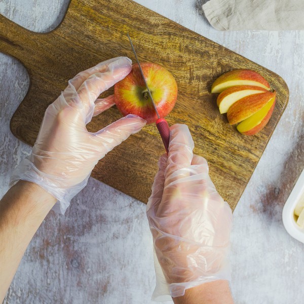 Completely compostable gloves for hygenic food handling. After use, simply throw them in the food waste bin together. Made from plant-based PLA, not plastic.