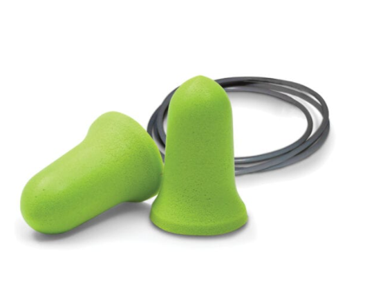 - Box of 100 corded pairsHi-vis green bell-shaped PU foam earplugs