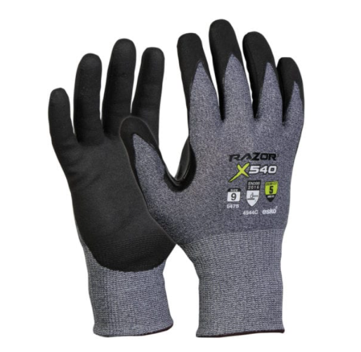 Razor X540 Cut Level 5 nitrile foam coat glove with reinforced thumb crotch, header carded