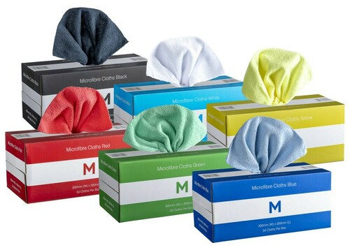 The rags measure 300mm (W) x 300mm (L) and come in a handy pack of 50 cloths. Available in a range of colours. Washable and reusable.