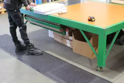 The Ergo Matting is a heavy duty anti fatigue mat which has moulded bubbles on the surface providing great comfort and relief which standing, ideal for workbenches and counters. Ergo Matting can be fabricated to any length.